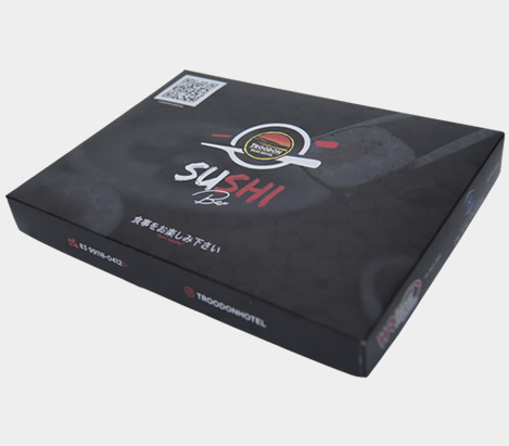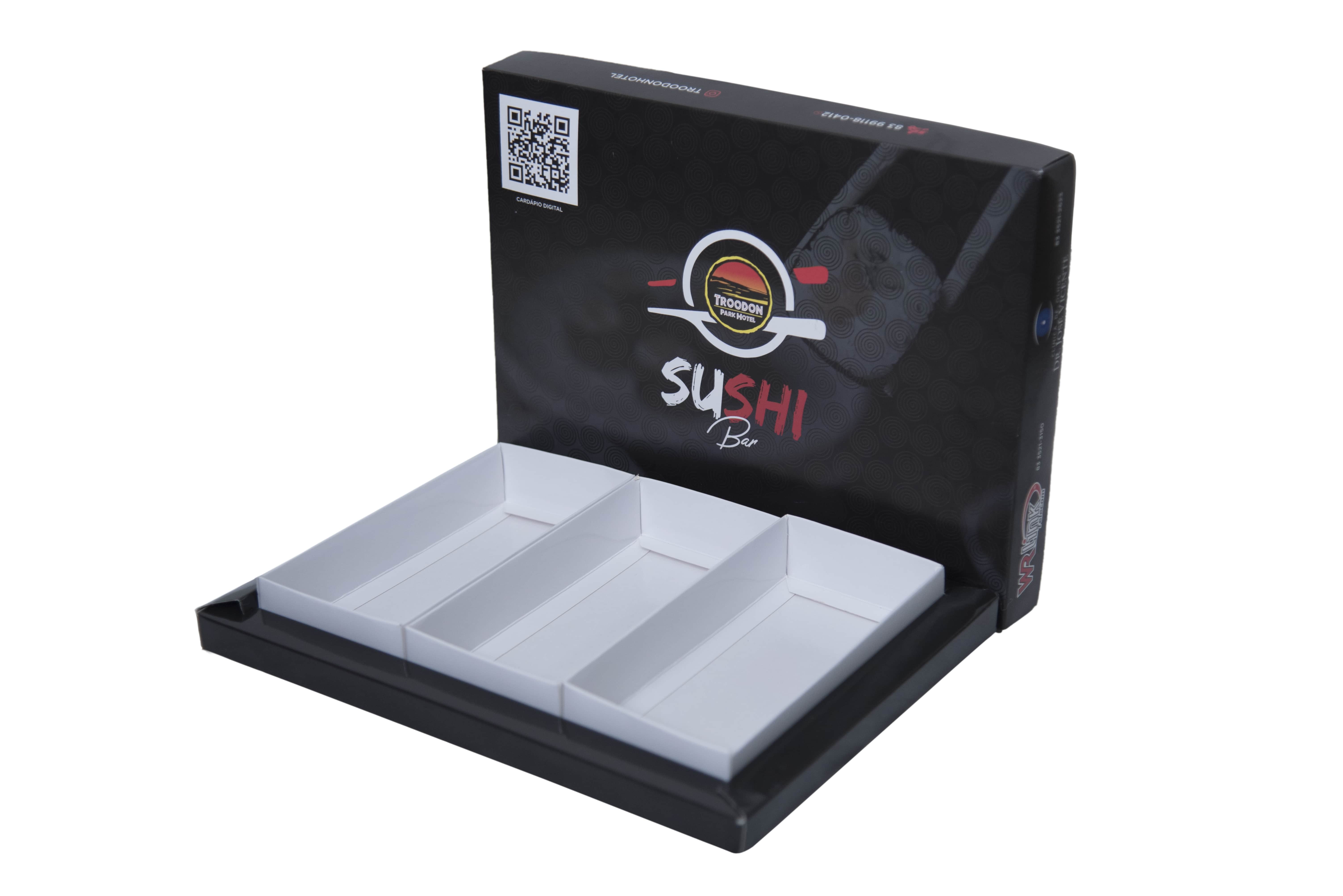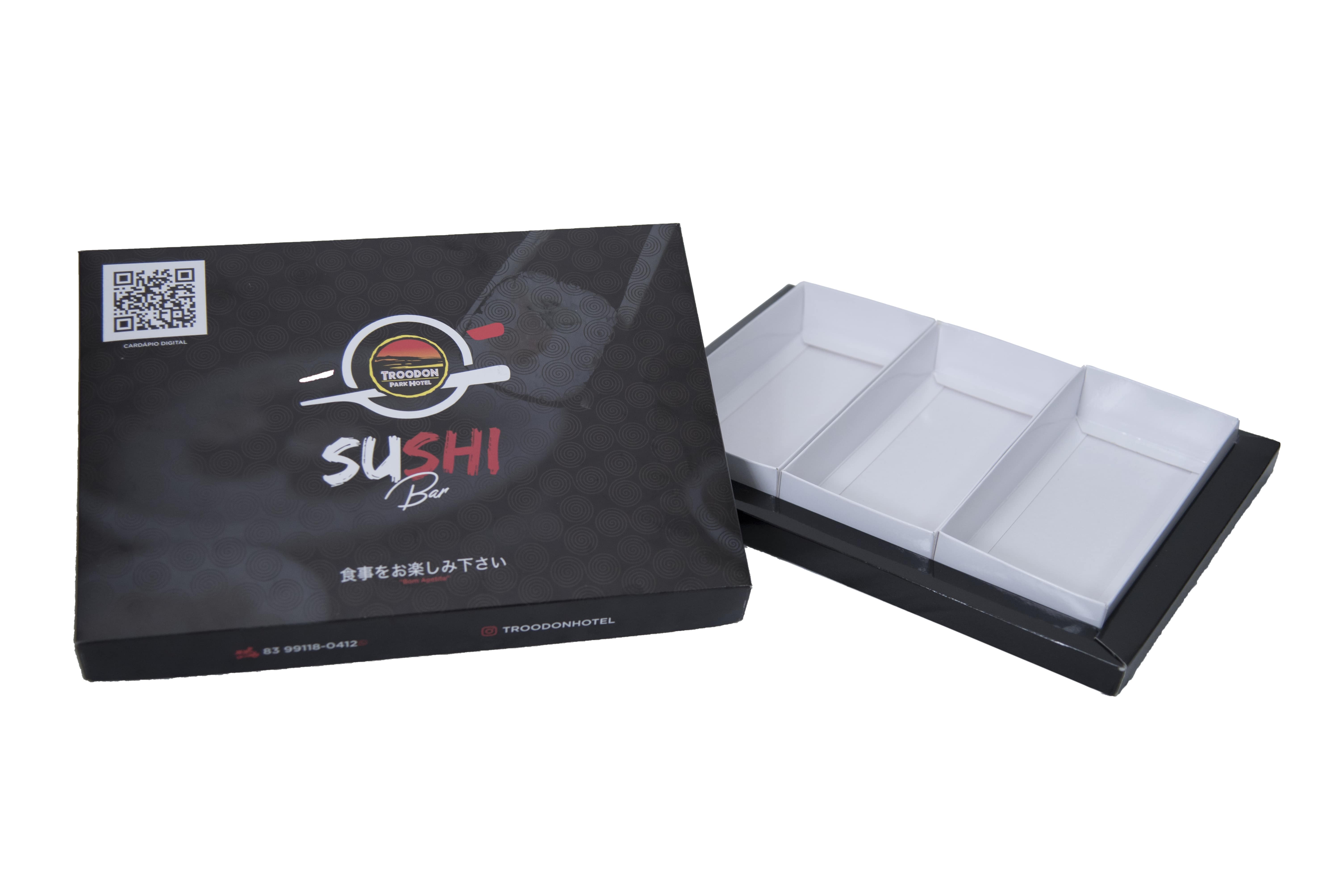 Caixa para Sushi em papel cartão, com divisórias, formato e acabamento especial em alta qualidade.